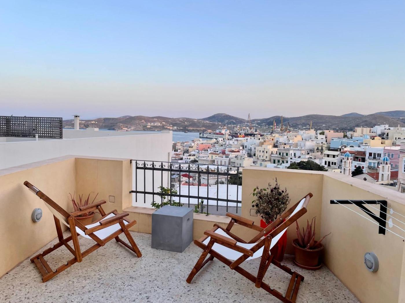 Suite with Terrace and Sea View. Τhis suite features a soundproofing, seating area and bathrobe. It opens to a spacious, private terrace with Ermoupoli views. Room comes with Laura Ashley linens and Tempur mattresses. ;