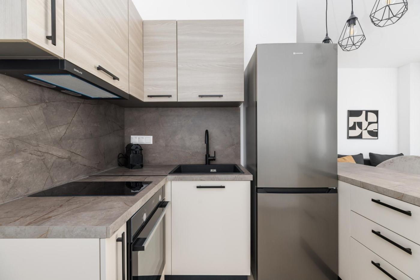 One-Bedroom Apartment with Balcony. The air-conditioned apartment has 1 bedroom and 1 bathroom with a shower and a hairdryer. The well-fitted kitchen features a stovetop, a refrigerator, kitchenware and an oven. The apartment features a washing machine, soundproof walls, a coffee machine, a flat-screen TV, as well as city views. The unit has 2 beds. ;